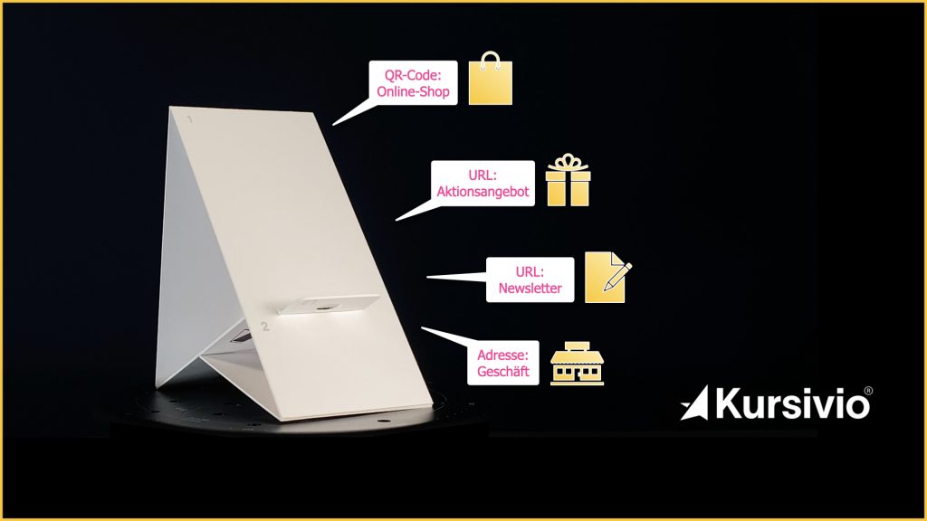 Kursivio im Bild: Ein Kursivio sendet Ihre Interessenten in Ihren Online-Shop, auf Ihre Webseite zum Aktionsangebot, zum Abonnement Ihres Newsletters und in Ihre Geschäft in der Stadt.